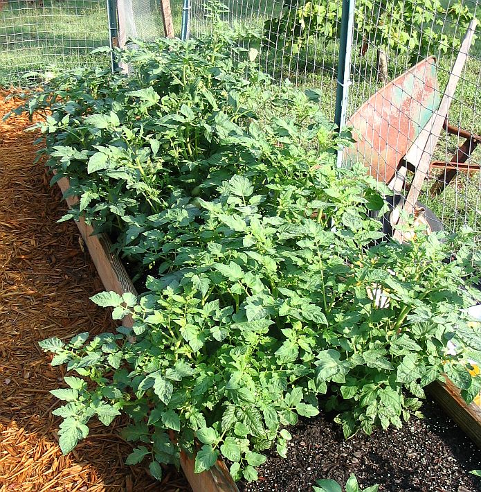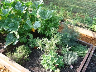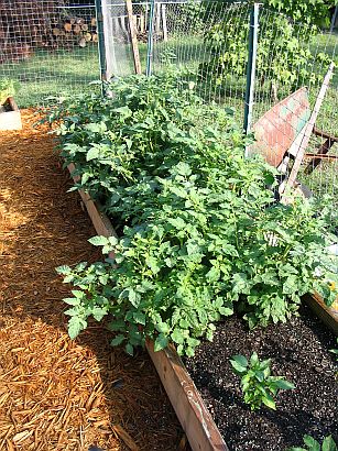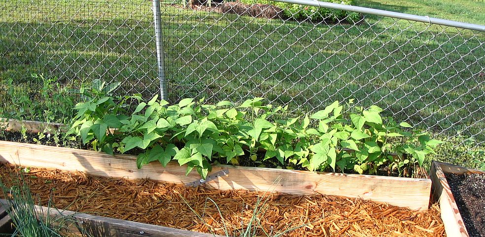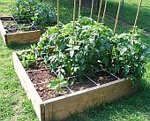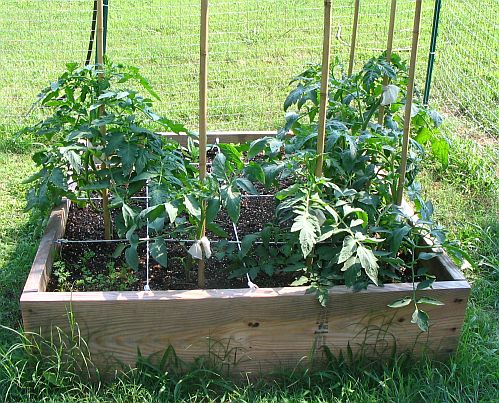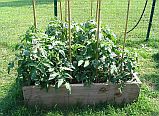 Raised bed #2 contains tomatoes, beans, and zinnias |