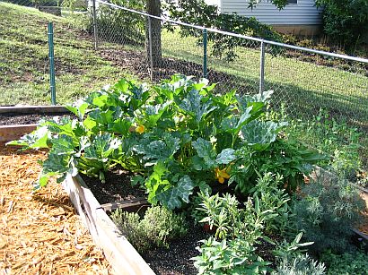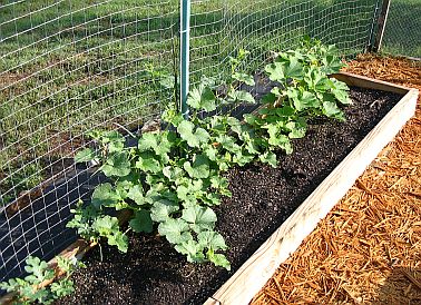 When you first walk into the garden, this is on your right. This box has watermelons (near left), cantaloupes (middle), and cucumbers (far right). We'll be putting up a sturdy trellis soon. |