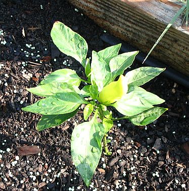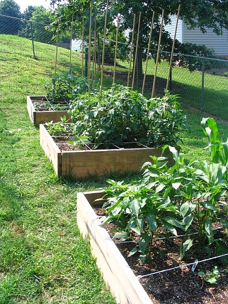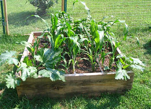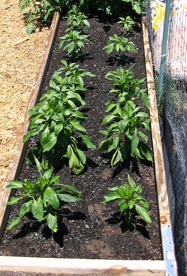 Raised bed #1 contains Sweet Corn, and a variety of peppers (Tabasco,