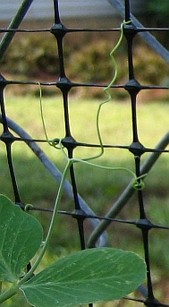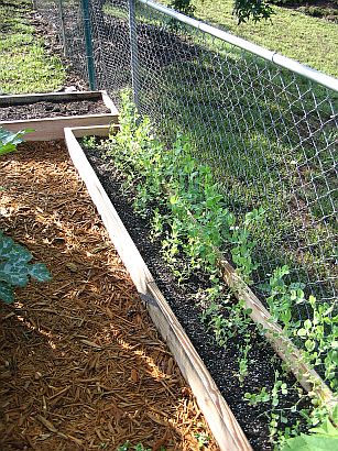 This is a pic of the peas. They're being allowed to climb the fence. The box in the background is empty. I'm planning to put radishes in the sunnier part and lettuces in the shadier part. Isn't it neat how those little tendrils grip the fence? |