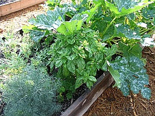 of my basil plants for making pesto. Here are the dill (left) and basil. This basil plant is getting huge and needs trimming back. The zucchini is trying to impinge on the herbs. It really likes to stretch out. |